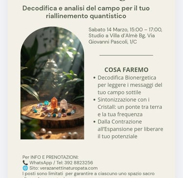"Scopri la tua impronta energetica originale. Attraverso la Mappa del Codice del Sé, analizziamo i talenti innati e le sfide evolutive che definiscono il tuo percorso. Grazie all'innovativo metodo dei Vettori di Riallineamento Quantistico, non ci limitiamo a una fotografia del tuo stato attuale, ma individuiamo le frequenze necessarie per sbloccare il tuo potenziale e riportarti in armonia con la tua missione profonda. Un ponte tra scienza del benessere e saggezza ancestrale per risintonizzare la tua bussola interiore."
